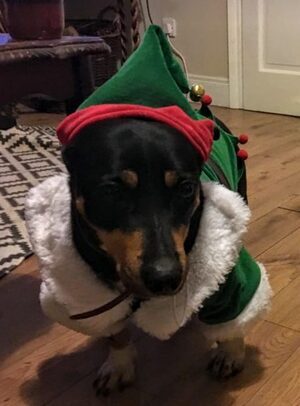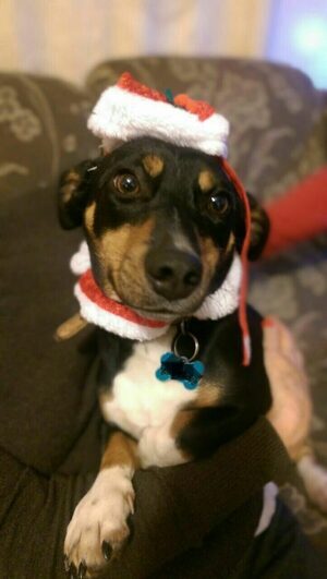 I sent in a picture of my dog Tayto [Collie/Jack Russel mix) three years ago (top). Here he is now again (above) after graduating to elf status…