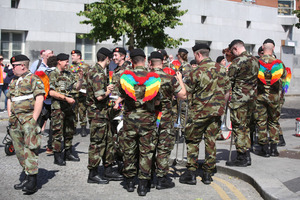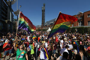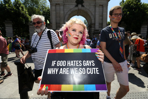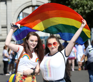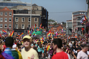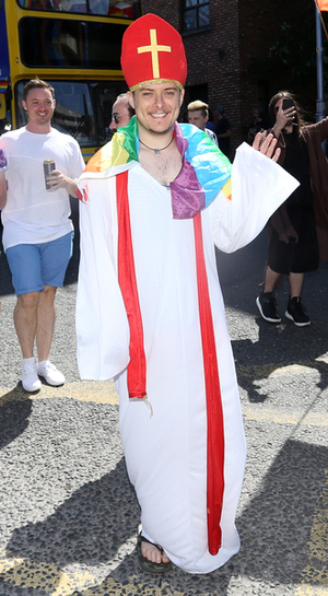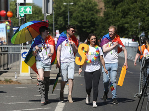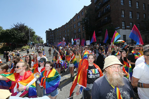 Rainbow-tied ‘revellers’ (including Papal visit protestors: pics 4-5m and former President Mary Mcaleese with her husband Martin, pic 8) at today’s Gay Pride parade through Dublin.