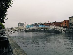 The ‘Up the Dubs’ banner that graced (defaced) the Ha’penny Bridge is no more. Dublin City Council review found it breached guidelines on protected structures and “materially affects the character” of the bridge…