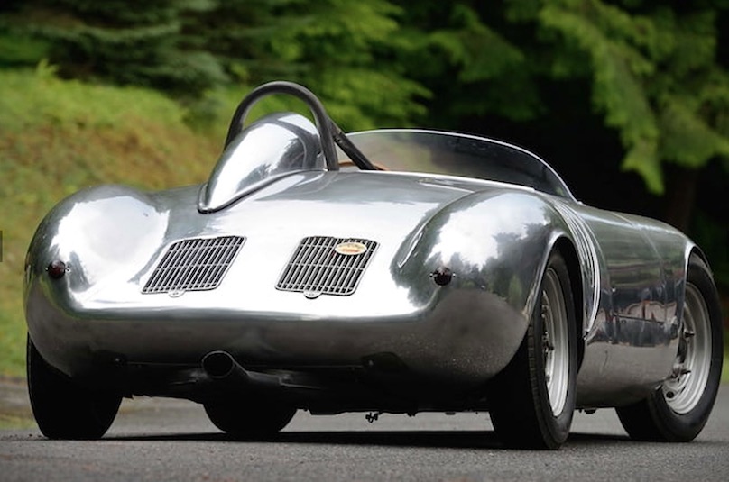 Behold: a characteristically spartan, meticulously restored Porsche 550A Spyder – a Ferrari-bothering, multiple race winner in its day (cousin of the ’Little Bastard’ 550 in which actor James Dean died) and one of only 39 such vehicles ever made.