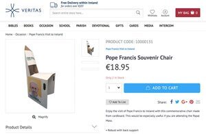 Sorry am I missing something here, it’s a cardboard chair, it wouldn’t hold up a 30kg 10 year old let alone a 100kg Assumpta from Portumna, and she’d be wanting it for 6/7 hours!, and the price! – IT’S A FECKIN’ CARDBOARD CHAIR!!! – “Robust, with back support” Ha! – They probably won’t let you in with it anyway. Just as bad as that commemorative coin that “your family will treasure for generations”. And the chair being sold by Veritas, Catholic Publisher and Retailer, a very Christian scam!