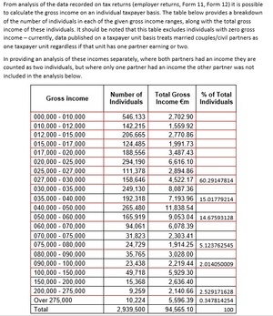 The table (above) provides a breakdown of the number of individuals in each of the given gross income ranges, along with the total gross income of these individuals. It should be noted that this table excludes individuals with zero gross income.