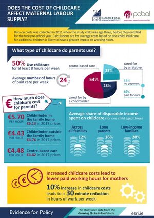 High childcare costs are linked to lower employment among mothers, according to an ESRI study funded by Pobal. It provides a breakdown of costs by type of childcare and the share of disposable income that households spend on childcare.
