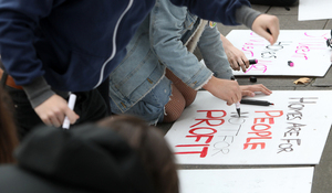 Students, including Sophie Gibbons from University College Dublin (top), prepare for the Raise The Roof protest taking place outside Leinster House today over the housing and accommodation crisis.
