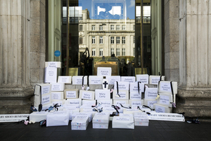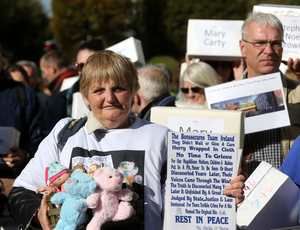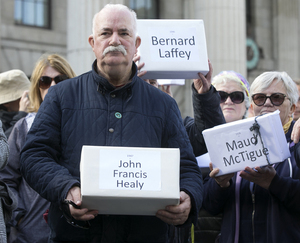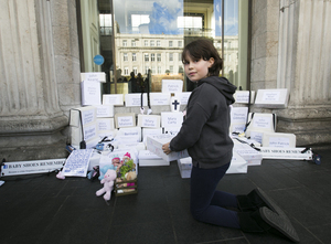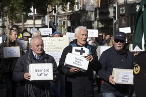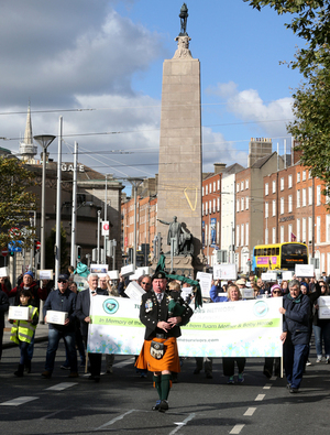 Marchers carrying white boxes repersenting the children who died in the Tuam Mother and baby Home during a silent ‘funeral’ procession from the Garden of Remembrance to the GPO, organised by the Tuam Home Survivors’ Network.