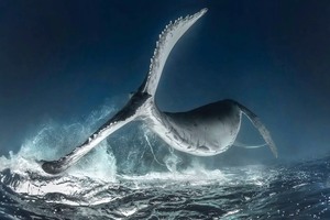From top: a whale breach by Rodney Burial (the overall winner); a blanket octopus night-fishing by Cai Songda and The Pit, an underwater cave near Tulum in Mexico by Karen Smith.