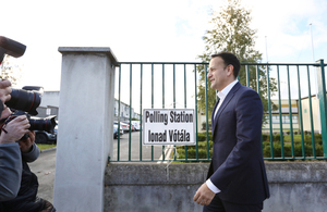 Taoiseach Leo Varadkar arrives to vote at the polling station in Scoil Thomáis, Laural Lodge, Castleknock, Dublin.
