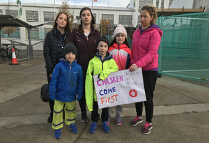 Parents with their children protest outside St Luke’s National School which will remain closed until Friday following safety concerns