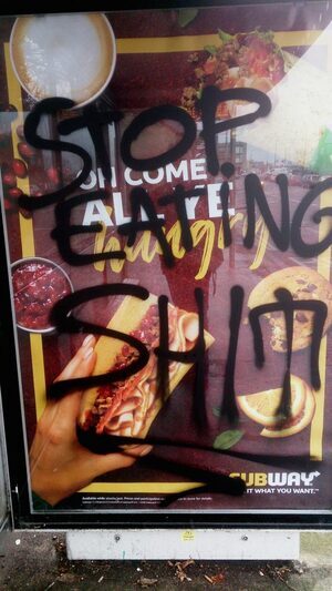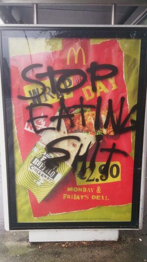 After ingredients and cooking, staff and overheads, all the corporate stuff including the cost of the defaced ads above, not to mention corporate tax, McDonald’s makes around 50c net profit on that “wrap”. How much for the ingredients? Probably 40- 50c. You couldn’t pay me to eat it.