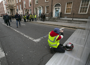 An enigmatic early arrival to a demonstration outside Leinster House poses mysteriously and later, from a sitting position, deploys a ‘BB’ air gun on a plastic bottle.