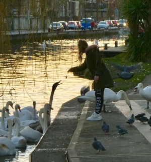 swanning around town. The cute pidgeons are waiting for swans to drop some cwumbs.