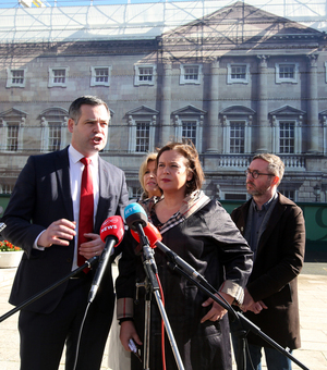 Catherine Murphy (right), with Roisin Shoirthall her co-leader in the Social Democrats, and Pearse Doherty (above left) with Sinn Féin colleagues from left: Rose Conway-Walsh, Mary Lou McDonald TD and Eoin Ó Broin TD speaking to the media after businessman Denis O’Brien lost his appeal to the Supreme Court over statements made in the Dáil about his banking affairs.