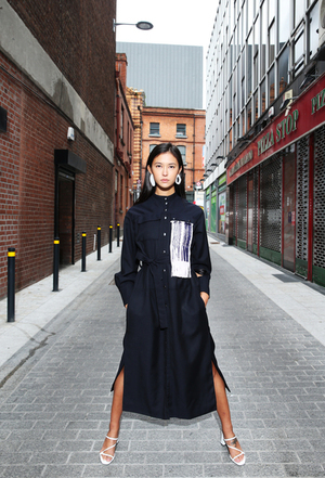Lian (top) sports a jacket dress with detachable wool fringing by Edel Traynor while Abbie (above) wears a design by Izzy O’Reilly entitled ‘The Corner Dress & Spit Bucket Trolley Bag’.