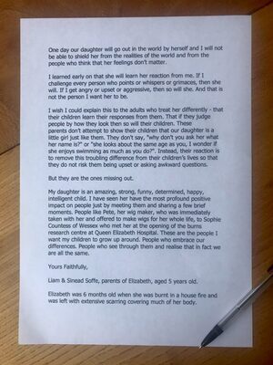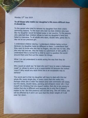 Reading the letter I went through the expected ‘rage’, ‘frustration’, ‘anger’ etc but I ended up with sadness for the adults in question and genuine joy and hope for the little girl, she has fantastic parents and can and will overcome anything and everything.