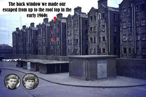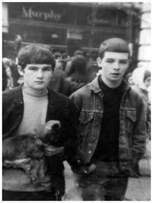 “This is Peadar and me, aged 16. Peadar is my best pal, he’s on the left in photo. We lived in Corporation Buildings [then on Corporation Street, now James Joyce Street, Dublin 1]. He escaped from an Industrial School in Cork and made it home. I remember a police raid on his room. We escaped out the back window five stories up. We got onto the roof top.”