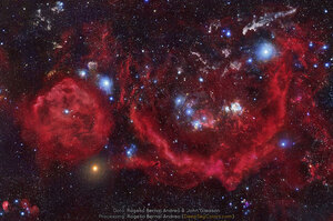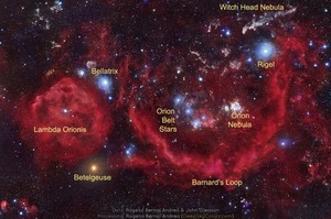 This is a more full Orion than you can see — an Orion only revealed with long exposure digital camera imaging and post-processing. Here the coolred giantBetelgeuse takes on a strong orange tint as the brightest star at the lower left. Orion’s hot blue stars are numerous, with supergiantRigel balancing Betelgeuse on the upper right, and Bellatrix at the upper left. Lined up in Orion’s belt are three stars all about1,500 light-years away, born from the constellation’s well-studied interstellar clouds. To the right of Orion’s belt is a bright but fuzzy patch that might also look familiar — the stellar nursery known as Orion’s Nebula. Finally, just barely visible to the unaided eye but quite striking here is Barnard’s Loop — a huge gaseous emission nebula surrounding Orion’s Belt and Nebula discovered over 100 years ago by the pioneering Orion photographer E. E. Barnard.