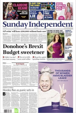 The state of the Sindo. Claudia Keane on loyalty, hah! Are we allowed talk about the British superinjunction which prevented British media reporting her hubby’s alleged dalliances? And the 1/4 page ad for womenly bladder control. Yep, at least the advertisers have probably got the measure of the Sindo audience alright.
