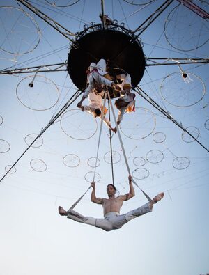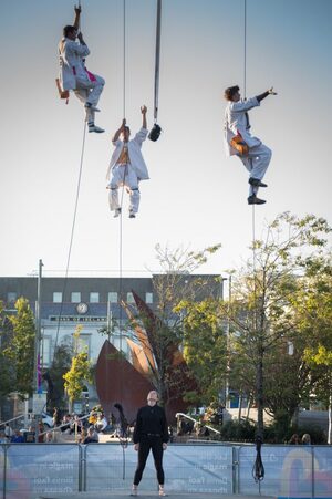 Members of the French performance company Gratte Ciel (skyscraper in English) preparing for their live performance alongside local musician and performer Anna Mullarkey (standing) at the launch of the Galway 2020 European Capital of Culture programme.