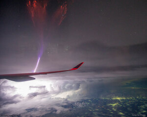 While flying from Munich to Singapore earlier this month, an industrious passenger took images of a passing lightning storm and caught something unexpected: gigantic jet lightning. The jet was captured on a single 3.2-second exposure above Bhadrak, India. Although the gigantic jet appears connected to the airplane’s wing, it likely started in a more distant thundercloud, and can be seen extending upwards towards Earth’s ionosphere. The nature of gigantic jets and their possible association with other types of Transient Luminous Events (TLEs) such as blue jets and red sprites remains an active topic of research.