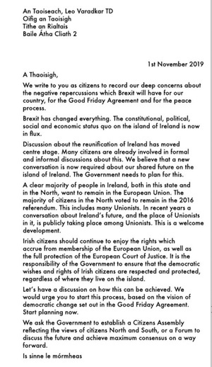 In the letter, the signatories are calling for a “new conversation” about the constitutional future of the island of Ireland.