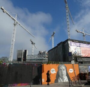An anti-hotel protest mural of Sister Michael from Derry Girls in Portobello, Dublin 8.