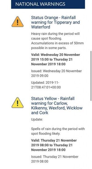 Rainfall warning updated with Carlow and Wicklow added to Yellow warning. A lot more rain to come over next few days 😔