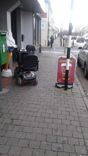 “Spotted on the street outside a shop in my home town. A mobility scooter for a mobility impaired gentleman blocking the path for other mobility impaired people.