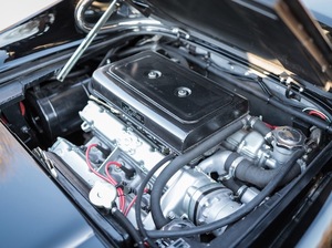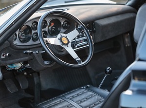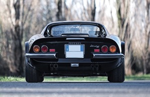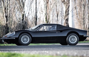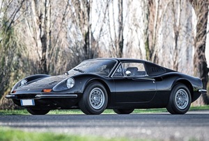 Behold: the 1973 Ferrari Dino 246GTS convertible: originally Giallo Fly yellow over a grey interior, refinished in black, with the original motor replaced by a period-correct block from another 246 and complete with the all important Ferrari Classiche certification.