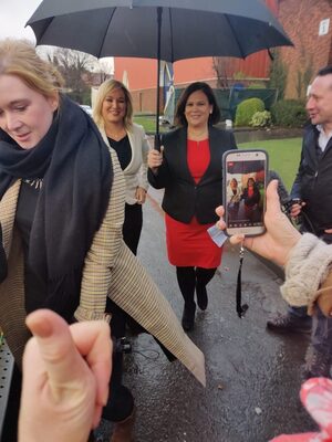 With her party heading for 30-36 seats, Sinn Fein President Mary Lou McDonald (left) with Northern Ireland Deputy First Minister Michelle O’Neill arrives at the Generel Election 2020 greater Dublin count centre.