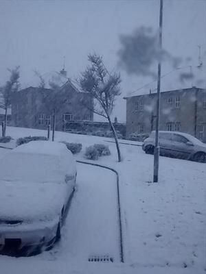 Different world up here! 200m elevation. 3 inches of snow here. Still snowing heavily