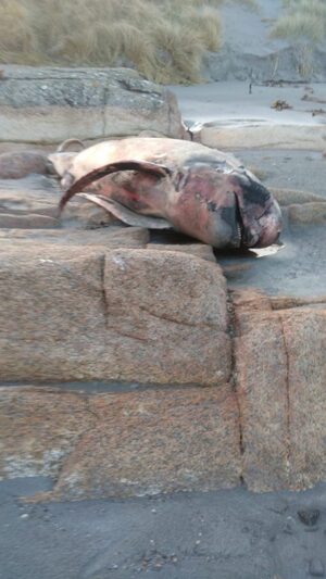 A female Long Fin Pilot Whale – measuring up to 19ft –  stranded on Arranmore Island.