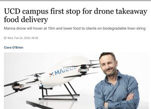 Next month a drone food delivery service will be launched at University College Dublin by Manna.