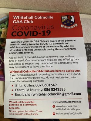 A leaflet from Whitehall Colmcille GAA Club, based on Collins’ Avenue in Dublin 9, offering help to people in the area.