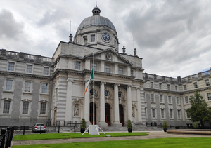 A defiant tricolour flies at half mast (actually 2/3) on the Department of Foreign Affairs for the late John Hume who died yesterday.