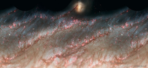 In fact, M51 is one of the original spiral nebulae, its winding arms described by a mathematical curve known as a logarithmic spiral, a spiral whose separation grows in a geometric way with increasing distance from the center. Applying logarithms to shift the pixel coordinates in the Hubble image relative to the center of M51 maps the galaxy’s spiral arms into diagonal straight lines. The transformed image dramatically shows the arms themselves are traced by star formation, lined with pinkish star-forming regions and young blue star clusters. Companion galaxy NGC 5195 (top) seems to alter the track of the arm in front of it though, and itself remains relatively unaffected by this unwinding of M51. Also known as the spira mirabilis, logarthimic spirals can be found in nature on all scales. For example, logarithmic spirals can also describe hurricanes, the tracks of subatomic particles in a bubble chamber and, of course, cauliflower.