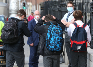 Belvedere College Principal Gerry Mooney (navy suit) at the doors of the secondary school checking for pupils not wearing masks.