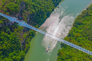 Behold: the longest glass bottomed bridge in the world, extending for over half a kilometre 200 metres above the Lianjiang River in China’s Huangchuan Three Gorges Scenic Area. Designed by Architectural Design & Research Institute of Zhejiang University, the span comprises three layers of 4.5cm-thick glass lined with steel and suspended from cables.