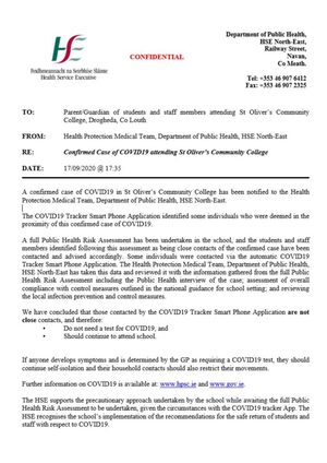 An email sent from the HSE to parents of St Oliver’s Community College in Drogheda, Co Louth on Wednesday evening