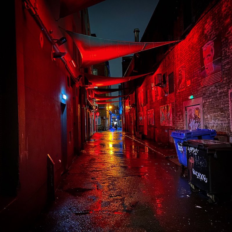 I like the contrast of the grim lane with the yokes above and how the light is catching them, plus it’s a brave man that whips his camera or phone out down any lane in Dublin.