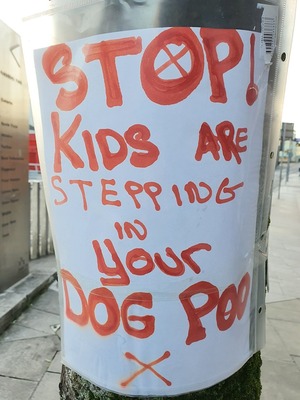 Stepped in dog plop yesterday myself, I’m tooty-boy sick of people with dogs.I had stop and tell a bloke that his dog had taken a poopy-poo right outside someone’s door, dog was off leash behind him.