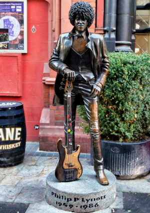 Phil Lynott, Phil was best known as the lead singer and bass player for the Rock band Thin Lizzy. He was an excellent frontman and lyricist. “When I’m in England I say I’m from Ireland, when I’m in Ireland I say I’m from Dublin, when I’m in Dublin I say I’m from Crumlin, when I’m in Crumlin I say I’m from Leighlin road, when I’m in Leighlin road I say I’m a Lynott”.Paul Daly‘s superb bronze sculpture of Phil Lynott is outside of Bruxelles Pub on Harry St reet just off Grafton Street. You may have to wait a moment to view the statue as so many fans commandeer it to take selfies. Daly managed to capture the swaggering essence of Phil whose life ended tragically far too early in 1986.