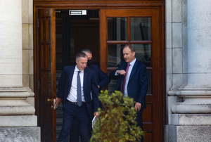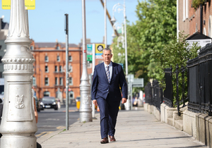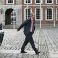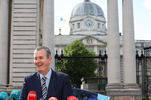 Recently-elected leader of the DUP Edwin Poots takes a swipe at Tanaiste Leo Varadkar while addressing media outside Government Buildings ahead of his first meeting with Taoiseach Micheal Martin.