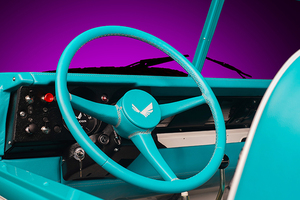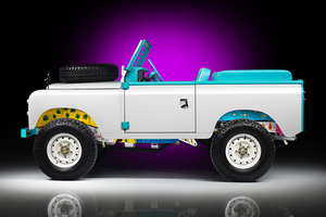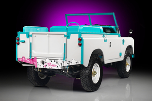 Powered by a 2.25 litre inline four engine, the donor vehicle’s white steel body (with aqua green trim and matching aqua green custom-upholstered interior) sits on a galvanised frame, hand painted by several artists with tropical fowl, ice-cream cones, palm trees, and pineapples, thereby evoking the ‘spirit of the Dade county’ using a vintage British off-road vehicle modified by Germans.
