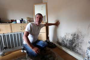 Michael Conway shows mould on a wall in his flat as Oliver Bond House residents held a press conference voicing their concerns as a new survey revealed that 83% of the 1,200 residents are living with mould and damp and that nearly three quarters (74%) have drafts and poor insulation which make it ‘impossible to keep their homes warm’.
