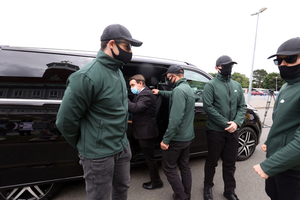 Election candidate and National Party leader Justin Barrett (in suit) and friends leave the RDS he Dublin Bay South by-election count centre for his bunker. He was eliminated on the third count.