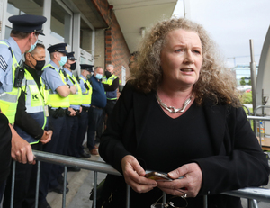 Independent Dublin Bay South candidate Dolores Cahill, a professor at the school of medicine at the University College Dublin, is denied entry to the by-election count centre without a face covering.
