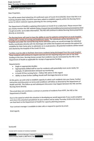 Peadar Toibīn: “Yesterday, under freedom of information, a document was released to me from the National Treatment Purchase Fund, (NTPF). The document was an email (above), which was issued to nursing homes by the contract manager of the NTPF shortly before 10am on 12 March 2020.