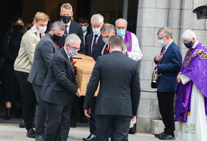 The coffin of Donncha Ó Dúlaing is carried from Our Lady Queen of Peace church following his funeral mass. The veteran Cork-born RTÉ broadcaster died aged 88 on September 4.