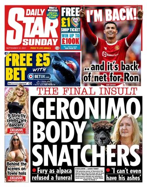Daily Star Sunday equates cremated alpaca to a human.
