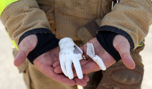 Dublin Fire Brigade District Officer John Mc Nally lights the fuse of a banger on the hand of a dummy – we shall call ‘Nigel’ – with horrific consequences during the launch of a Halloween fireworks danger awareness campaign at the Dublin Fire Brigade Training Centre.